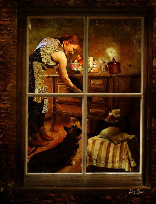 I created this for a challenge for the Tara Lesher course I'm in. She wanted us to do something vintage and I had taken this photo of my daughter and her corgi about 7 years ago at Thanksgiving that always looked vintage to me. I changed out the modern stove, removed the dishwasher, cabinets, and added Alexas Photos stove on Pixabay, Lynne Anzelc's Brewed and Cobblestone scrap art elements and several texture layers.