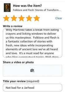 "Willy Martinez takes a break from eating crayons and licking windows to deliver us this masterpiece. Folklore and flesh is a fantastic collection of stories with fresh, new ideas while incorporating elements of ancient lore we've all heard and love. It's a must read for anyone who likes supernatural topics. Well done [sic]." Title: Not bad for a Jarhead